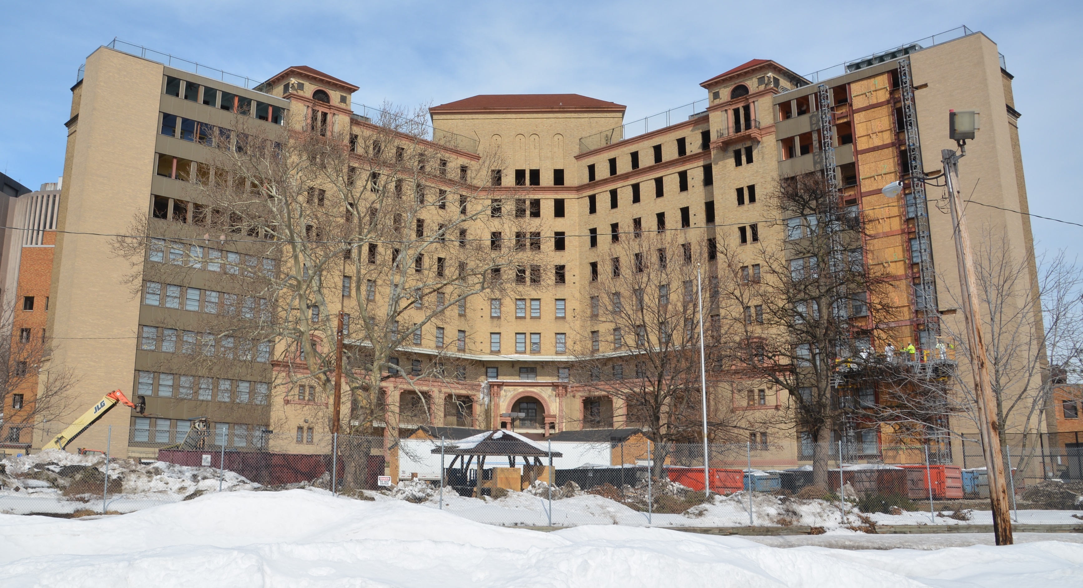 The Metro Health’s main campus began their multimillion dollar campus expansion with the demolition of the former North Coast Behavioral Health (NCBH) Building. Independence Excavating, Inc. (IX) was awarded the complete mass demolition of the entire existing structure. The original NCBH Building was built around 1922, as part of a modern hospital complex for the City of Cleveland. The building was constructed of steel framing with concrete casing, and finished with a brick exterior façade. There were several alterations and expansions throughout itsnearly 100 years of use and history, which—as often occurs—resulted in less detailed records, a situation that created many challenges for our project team. The main bed tower stood 10 stories high, with later additions of two annex buildings to the east and west. A two-story, tiered lecture room was also expanded upon—on the 11th and 12th floors of the bed tower—at some point in this building’s history. It was the latter—the expanded lecture room—that made the job interesting. IX first installed ten 15’x30’ steel debris catchers to protect people and property, 160’ below the initial work. We selectively demolished the lecture room and three bed tower floors with mini excavators and skid steers, totaling approximately 50,000 sf of building. Once demolition had been completed to the 7th floor, IX mobilized our 245 High Reach Excavator and let our crews go to work! When demolition of the entire structure was completed, we crushed nearly 35,000 tons of building materials into a blended hard fill, which we used for backfill and general site restoration. Nearly 225,000 SF of building was demolished in its entirety.